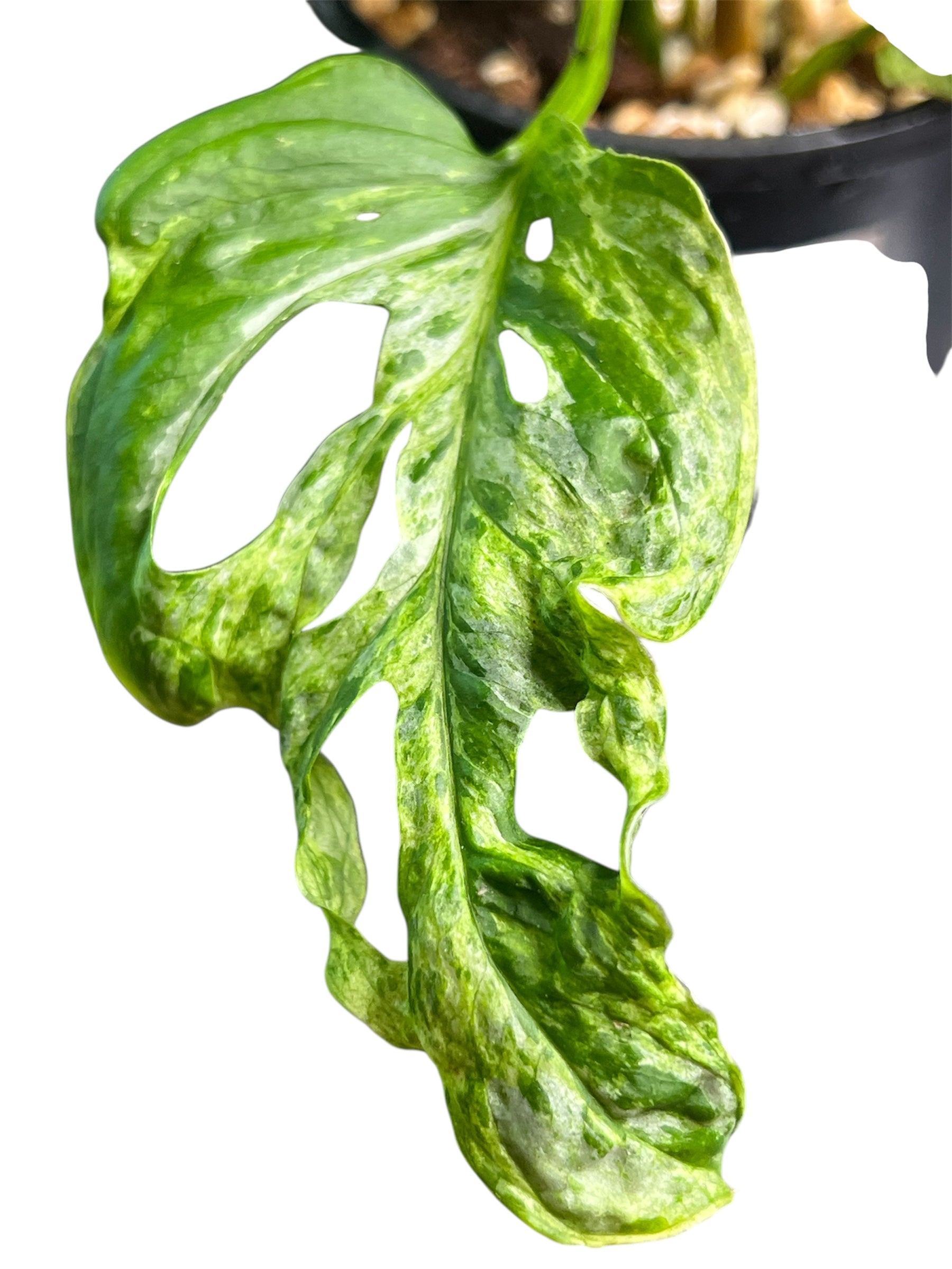 Rare and eye-catching with creamy/white mottled variegation on classic fenestrated leaves. Fast-growing and easy to care for — a must-have for collectors! A good starter plant.